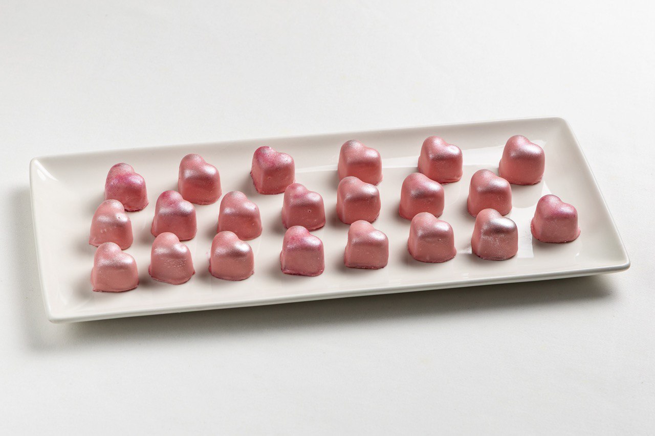 Всех гостей ждёт милый комплимент в виде розового мармеладного сердца, покрытого шоколадом.