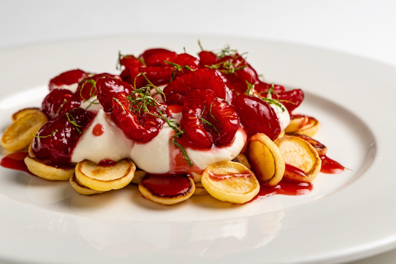 - Мини оладьи с кремом маскарпоне и малиной
